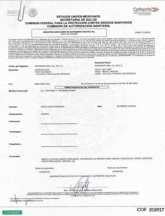 MIYAMINO POWER producto hecho a base de aminoácidos, que estimula el desarrollo vegetativo, funciona como un inductor de tolerancia a diferentes estados de estrés provocados a la planta, aporta elementos nutritivos, estimula la actividad metabólica mejorando las condiciones de desarrollo de floración y uniformidad en la maduración y tamaño de los frutos